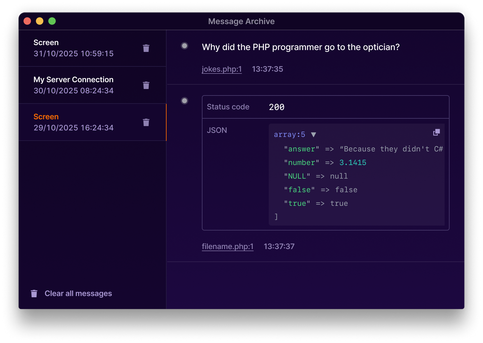 Instead of losing your logs when you clear your Ray window, save them. The new message archive stores all your logs, from any local or remote project, on disk.